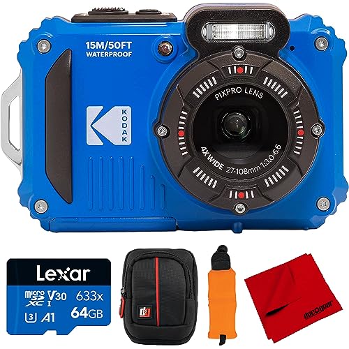 **Kodak WPZ2-BL PIXPRO Full HD Rugged Waterproof Digital Camera, 16MP, Blue Bundle with Lexar 64GB Memory Card, Deco Photo Camera Case, Vivitar Orange Camera Wrist Strap and Microfiber Cleaning Cloth**
