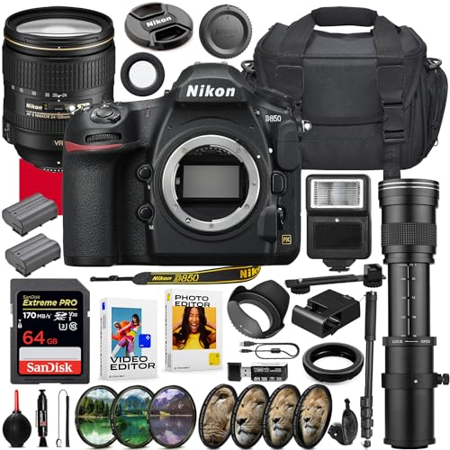 **Nikon D850 DSLR Camera with 24-120mm Lens Bundle + 420-800mm Zoom Telephoto Lens + Accessory Kit w/Photo/Video Editing Software Package, 64GB Extreme Memory, Extra Battery, Filters & More**