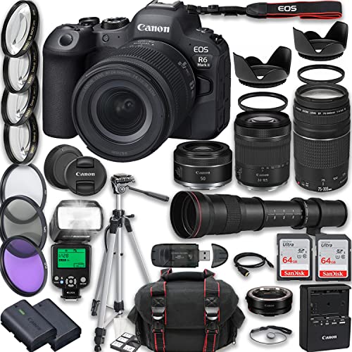 Canon EOS R6 Mark II Mirrorless Camera with RF 24-105mm STM + EF 75-300mm III + RF 50mm f/1.8 STM + 420-800mm HD Lenses + Accessories: 2X 64GB Memory Cards + TTL Flash, Extra Battery, Case & More