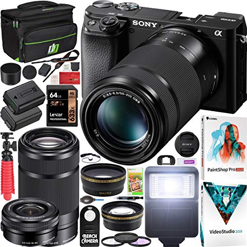 - CAMERA INCLUDES: Sony Alpha a6100 Mirrorless Digital Camera Body ILCE-6100YB | SELP1650 E PZ 16-50mm f/3.5-5.6 OSS Lens | SEL55210 E 55-210mm F4.5-6.3 OSS Lens | Lens Cap | Rear Lens Cap | Lens Hood | Sony NP-FW50 Lithium-Ion Rechargeable Battery | AC-UUD12 AC Adaptor | Sony ALC-B1EM Body Cap | Micro-USB Cable | Shoulder Strap | Accessory Shoe Cap | Eyepiece Cup | Limited 1-Year Warranty