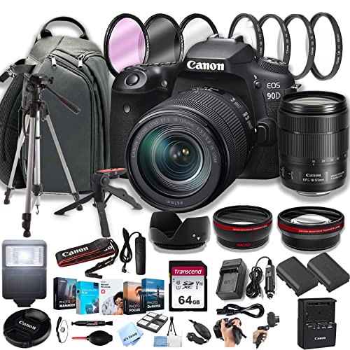 - Canon EOS 90D Digital SLR Camera w/ Canon EF-S 18-55mm f/3.5-5.6 is STM Lens - 2x Transcend 64GB SD Memory Card - 58mm 2X Professional Telephoto Lens - High Definition 58mm Wide Angle Lens - 3 Piece Filter Kit (UV-CPL-FLD)- 4 Piece Lens Close-Up Set