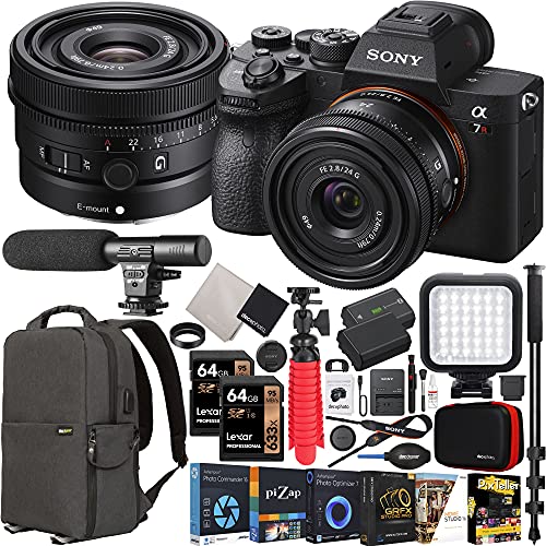 - BUNDLE INCLUDES: Sony FE 24mm F2.8 G Full Frame Ultra-Compact G Lens SEL24F28G | Deco Gear Photography Backpack | Condenser Microphone | Adjustable Monopod Stabilizer | Lexar Pack of 2 64GB SDXC Memory Cards | Compatible Battery for NP-FZ100 | LED Camera Light | 12" Tripod / Grip 2in1 | Deco Photo Accessory Kit: Carry Case, Lens Blower, Sensor Brush, Lens Tissue, Microfiber Cloth | PC Software: piZap PRO, Photo Commander 16, Photo Optimizer 7, GRFX Studio Pro, PixTeller, Vegas Movie Studio 16